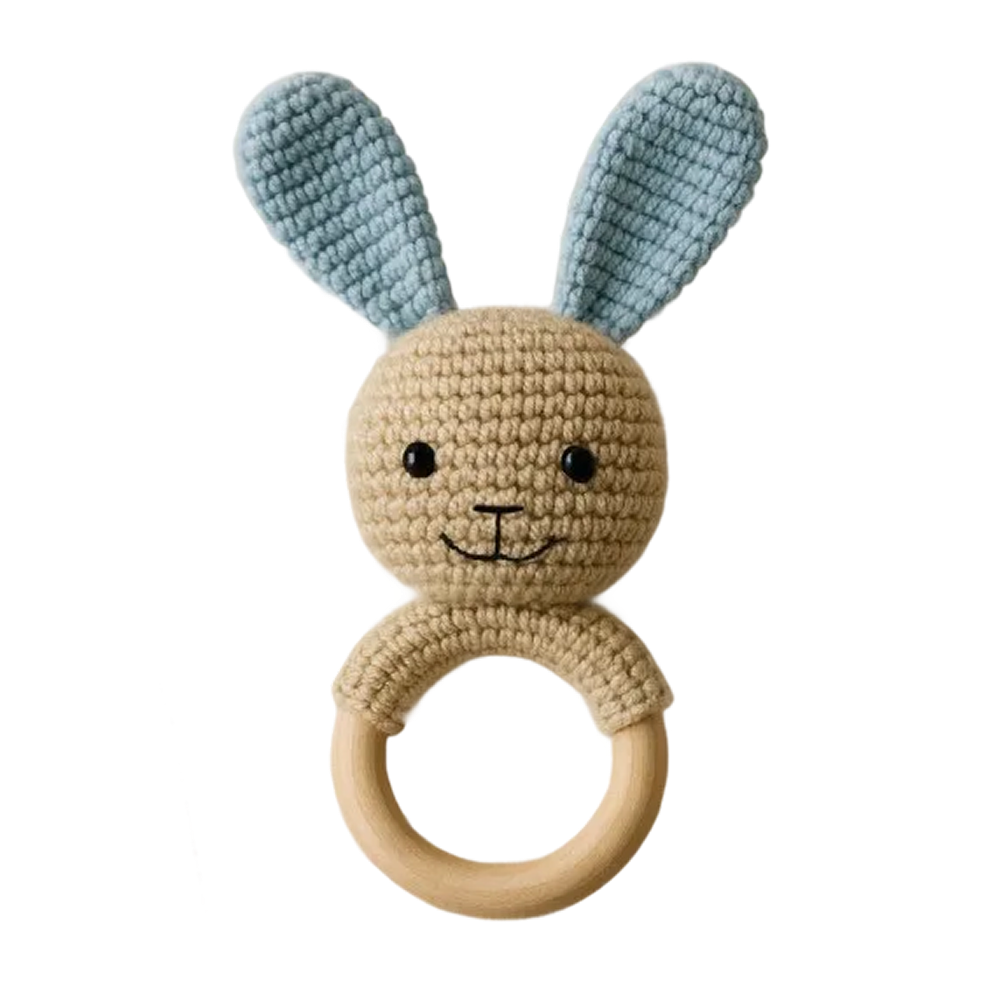 Handmade Baby Bunny Rattle, Blue Wooden Ring Toy