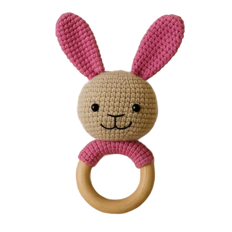 Handmade Baby Bunny Rattle, Pink Wooden Ring Toy